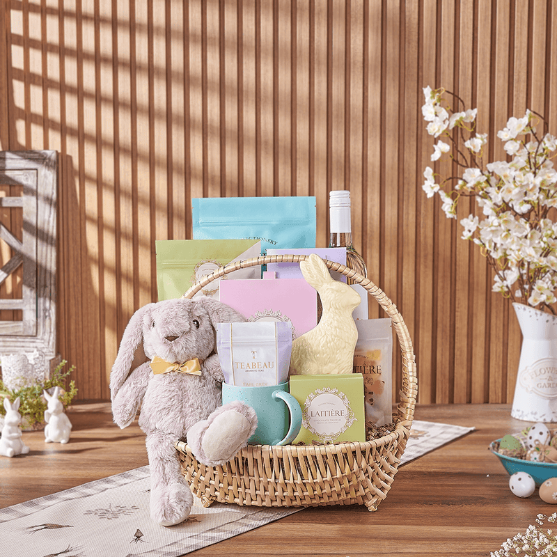 The Easter Feast & Wine Gift is a surefire delight for friends, loved ones, and colleagues this spring! This gift includes a bottle of wine, white chocolate caramel popcorn, green tea matcha cookies, a dark chocolate bar, white chocolate truffles, gummy bears, a white chocolate bunny, assorted chocolate truffles, Earl Grey tea, a blue speckled mug, a plush bunny toy, and a wicker gift basket for presentation and display. You may add on wine, champagne, gourmet snacks, and more from our custom options.