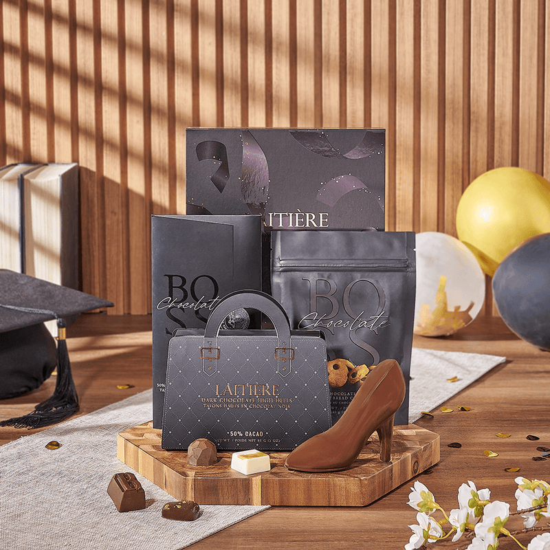 For a delicious way to celebrate this big moment with something sweet, indulge in the Graduation Chocolate Gift. This gift set features champagne-inspired chocolate truffles, a dark chocolate bar, dark chocolate mocha cookies, dark chocolate high heels, and a hexagonal serving board. For a personal touch, you may add on wine, champagne, fruit, flowers, and more from our custom options.