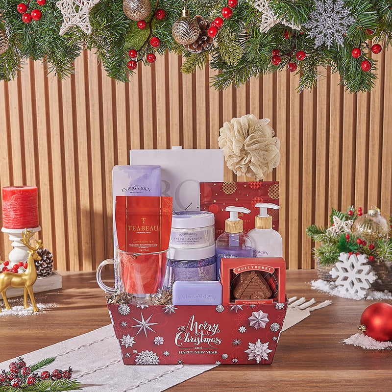 The Holiday Teatime Spa Gift is a truly timeless gift for anyone who could use a revitalizing spa day during the holiday season. Included in this gift are white chocolate truffles, white chocolate cranberry cookies, a lavender oil diffuser set, body butter, body wash, body lotion, bath salts, bar soap, a milk chocolate cottage, cinnamon tea, a double-wall glass mug, and a holiday gift tray. Of course, for a more personal touch, you may add on goodies like wine, champagne, gourmet snacks, and more from our custom options.
