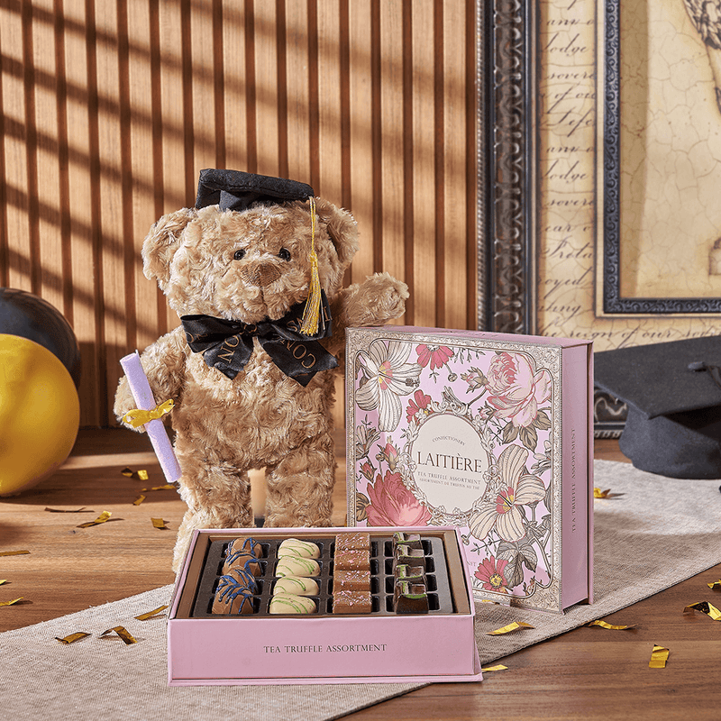 The Indulgent Graduation Gift Set is a charming way to treat someone on their big day! Send a stunning graduation gift to mark this exciting moment. This gift includes a plush graduation teddy bear and a box of tea-inspired chocolate truffles. The adorable bear wears a graduation cap and holds a diploma. You may even add on wine, champagne, fruit, flowers, and more from our custom options.